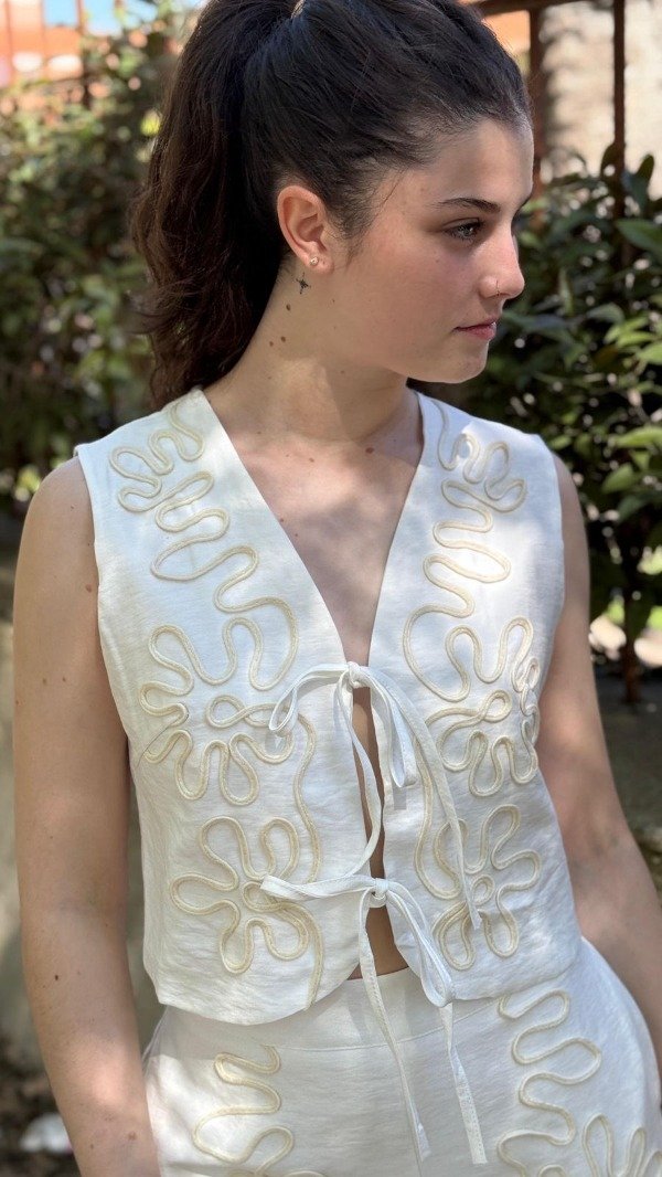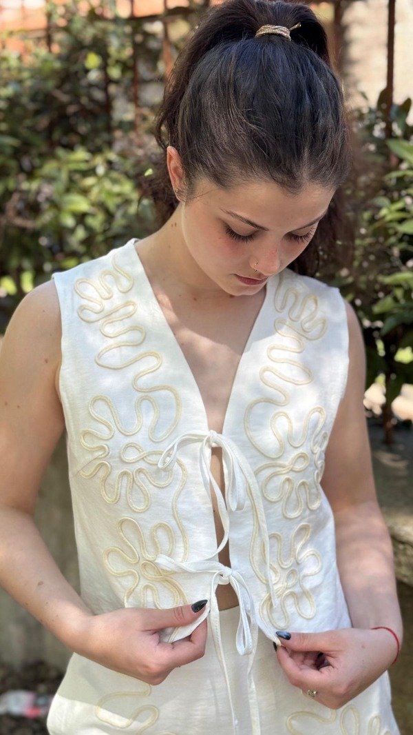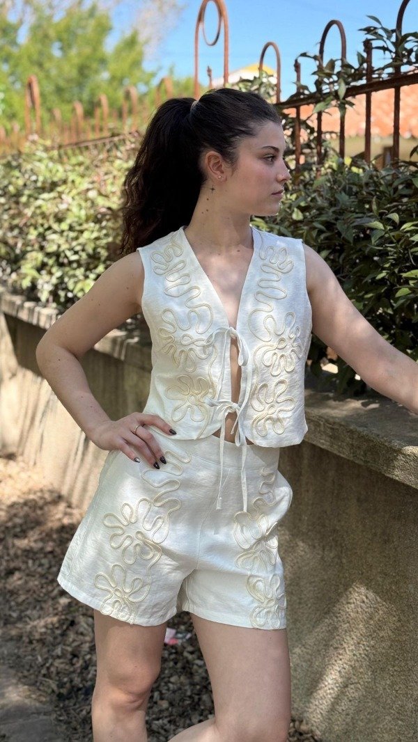 CONJUNTO DE LINO CON APLIQUE DE CORDÓN DE ALGODÓN COLOR BEIGE