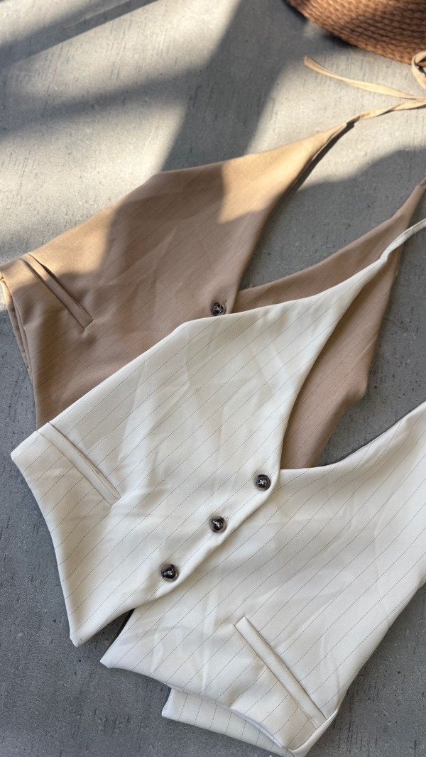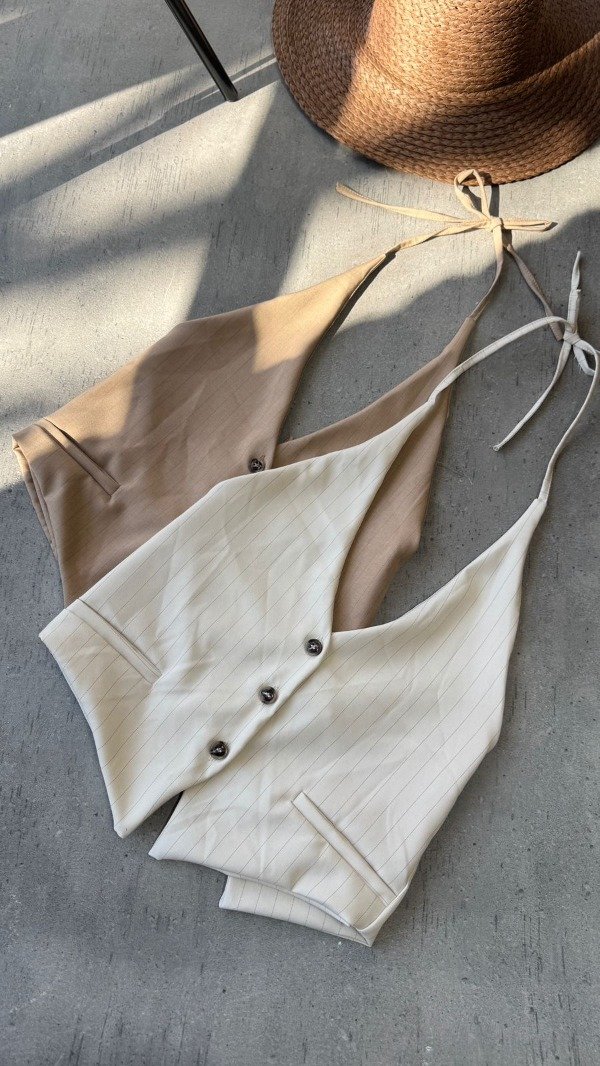 TOP SASTRERO CON ESPALDA DESCUBIERTA, RAYADO SUTIL EN COLOR CHOCOLATE